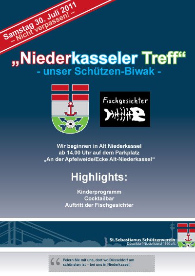 Ein Dorffest für alle Bürger in und um Niederkassel. Leckeres aus der Dorfmetzgerei frisch vom Grill. Selbstgebackene Kuchen, frisches Bolten vom Fass, exotische Cocktails, Livemusik von der Düsseldorfer Kultband “Fischgesichter”, tolle Aktionen für Kinder und viele, viele nette Leute. Feiern da wo Düsseldorf am Schönsten ist…in NIEDERKASSEL!!!