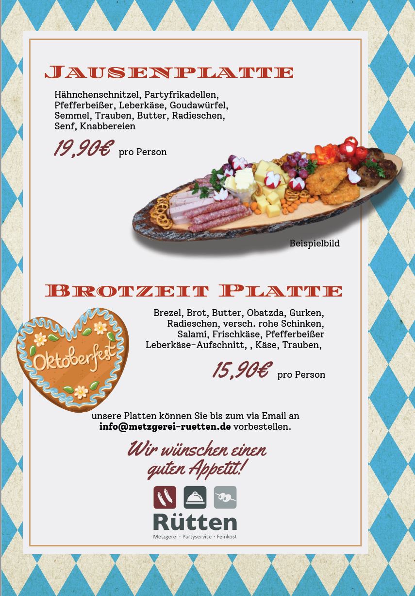 Nutzen sie die Gelegenheit das Essen zum Oktoberfest vorzubestellen! Keine Wartezeit vor Ort! Unser neuer Cateringpartner „Metzgerei Rütten“ steht Ihnen hier gerne zur Verfügung.