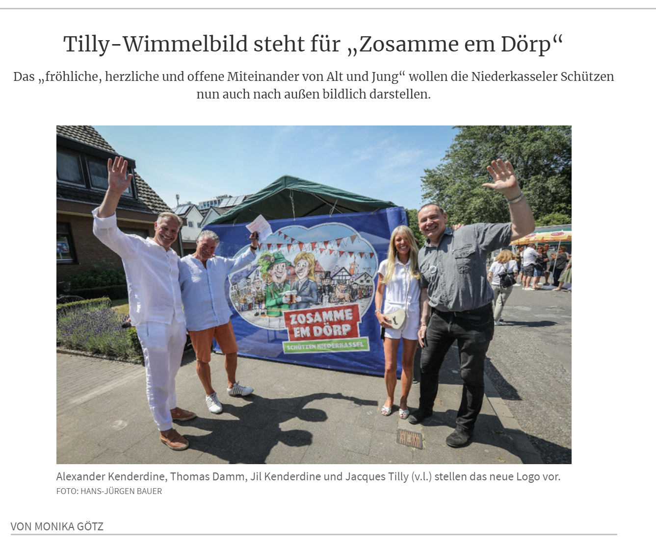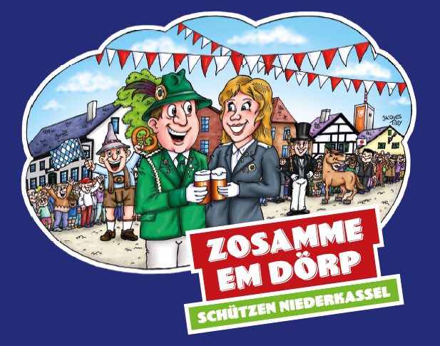 Jacques Tilly, der durch seine Illustrationen und Großplastiken – unter anderem jedes Jahr im Düsseldorfer Rosenmontagszug – weit über die Düsseldorfer Grenzen hinaus bekannte Künstler, hat für die Schützen Niederkassel dieses wunderbare Bild geschaffen, welches das neue Motto „Zosamme em Dörp“ liebevoll bis ins kleinste Detail darstellt.